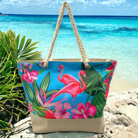 Bolso de mano informal de verano para mujer, poliéster personalizado con estampado de flamencos, diseño de viaje impermeable, cierre de cremallera, bolso de playa