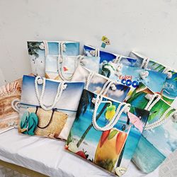 Venta al por mayor China calidad sublimación impresa lienzo playa bolso de mano 2024 personalizado gran bolso de las mujeres colorido viaje bolsa de vacaciones