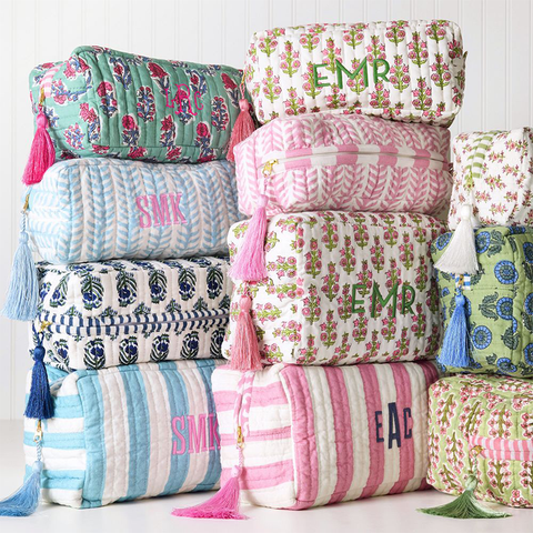 Bolsa de cosméticos de lujo acolchada floral personalizada al por mayor, neceser cuadrado para mujer, bolsas de maquillaje con logotipo bordado personalizado con borla